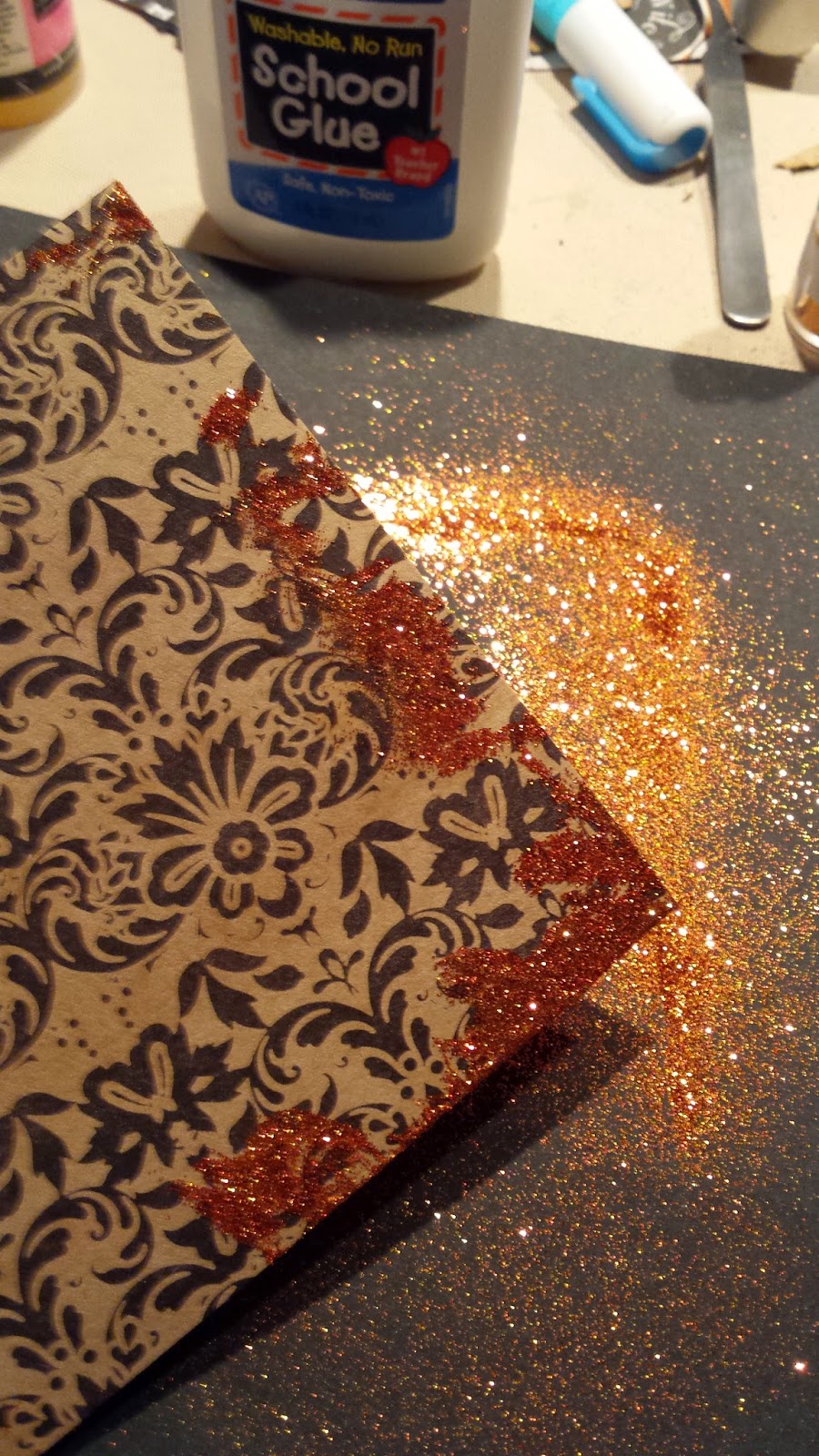 Step 4: Cut out from using the Spellbinders Majestic Squares dies in black cardstock. I used Silver Rub n Buff to give a old look. Pop Dot your photo onto this piece. and begin layering and added embellishements!! As see above I used Orange Glitter to bring out the Pattern Piece and to give the card more sparkle! Dont forget to run the pattern piece that is now glittered through your Xyron Create a Sticker Max to make it easy to peel and stick to build the card. SEE PHOTOS BELOW!!